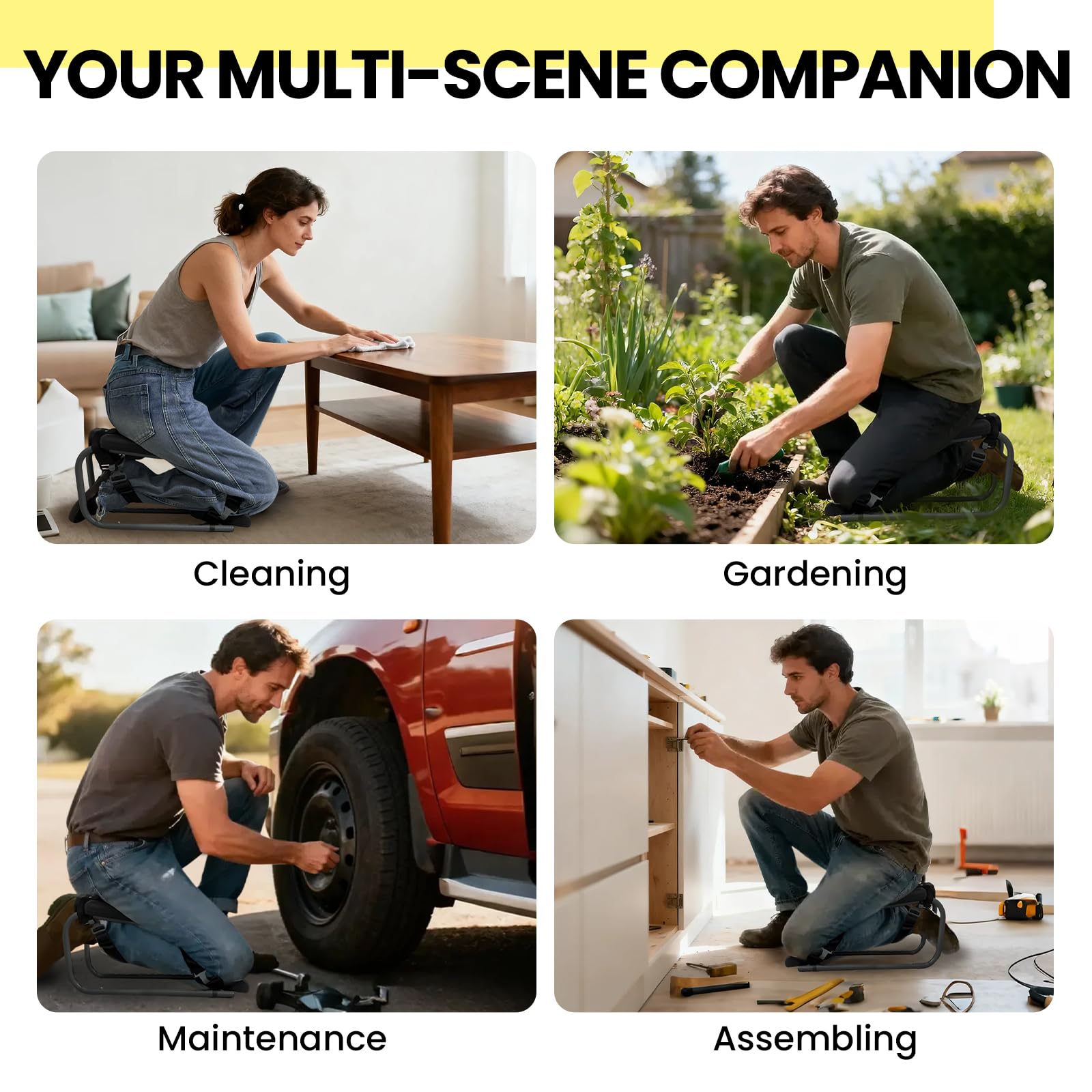 From planting flowers and cleaning floors to car maintenance and assembling furniture, this is your versatile companion. Enjoy hands-free stability and comfort for any low-down job.