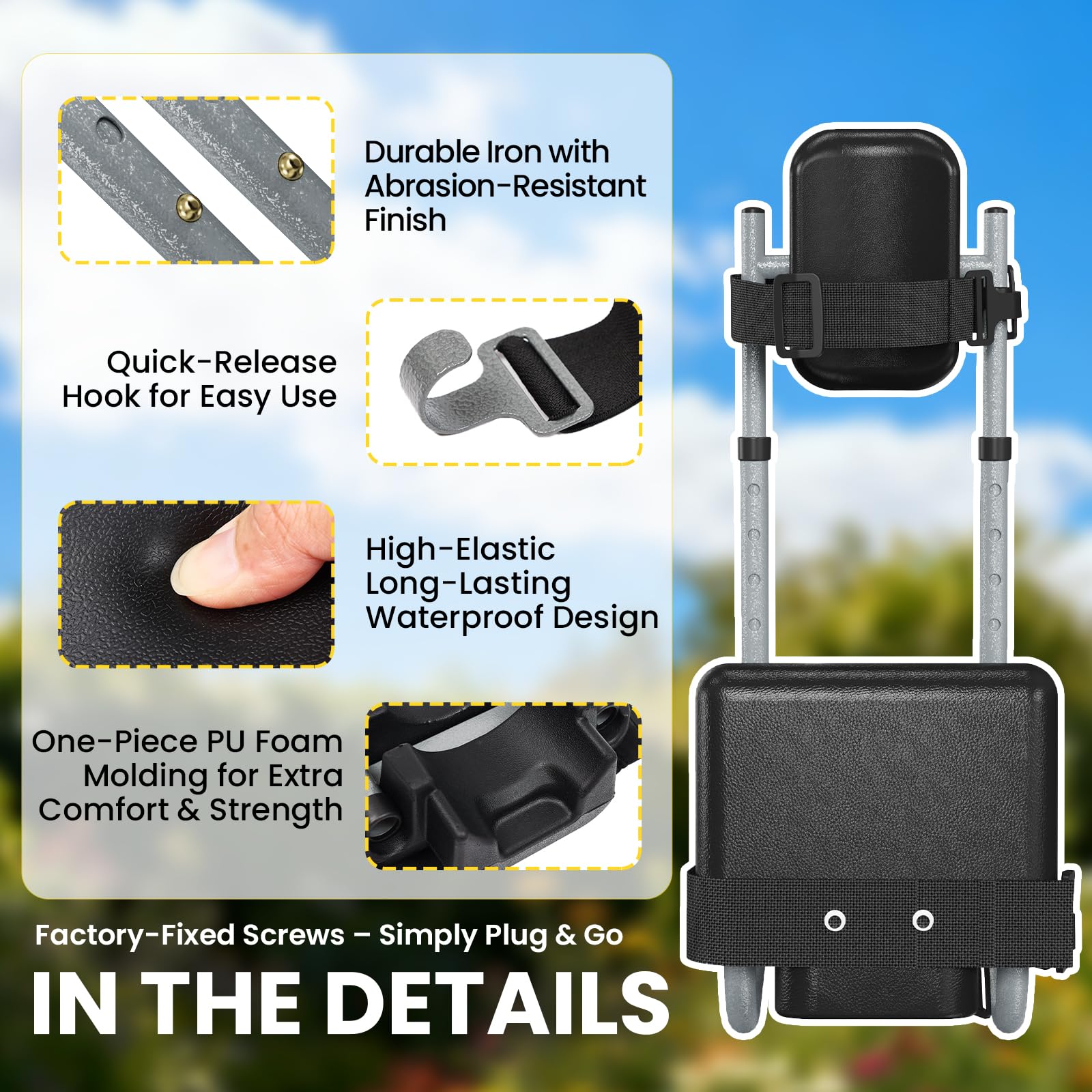 Crafted with a durable iron frame and a high-elastic, waterproof PU foam pad. The quick-release hook makes it easy to put on and take off, while the one-piece molded cushion provides extra comfort and strength, job after job.